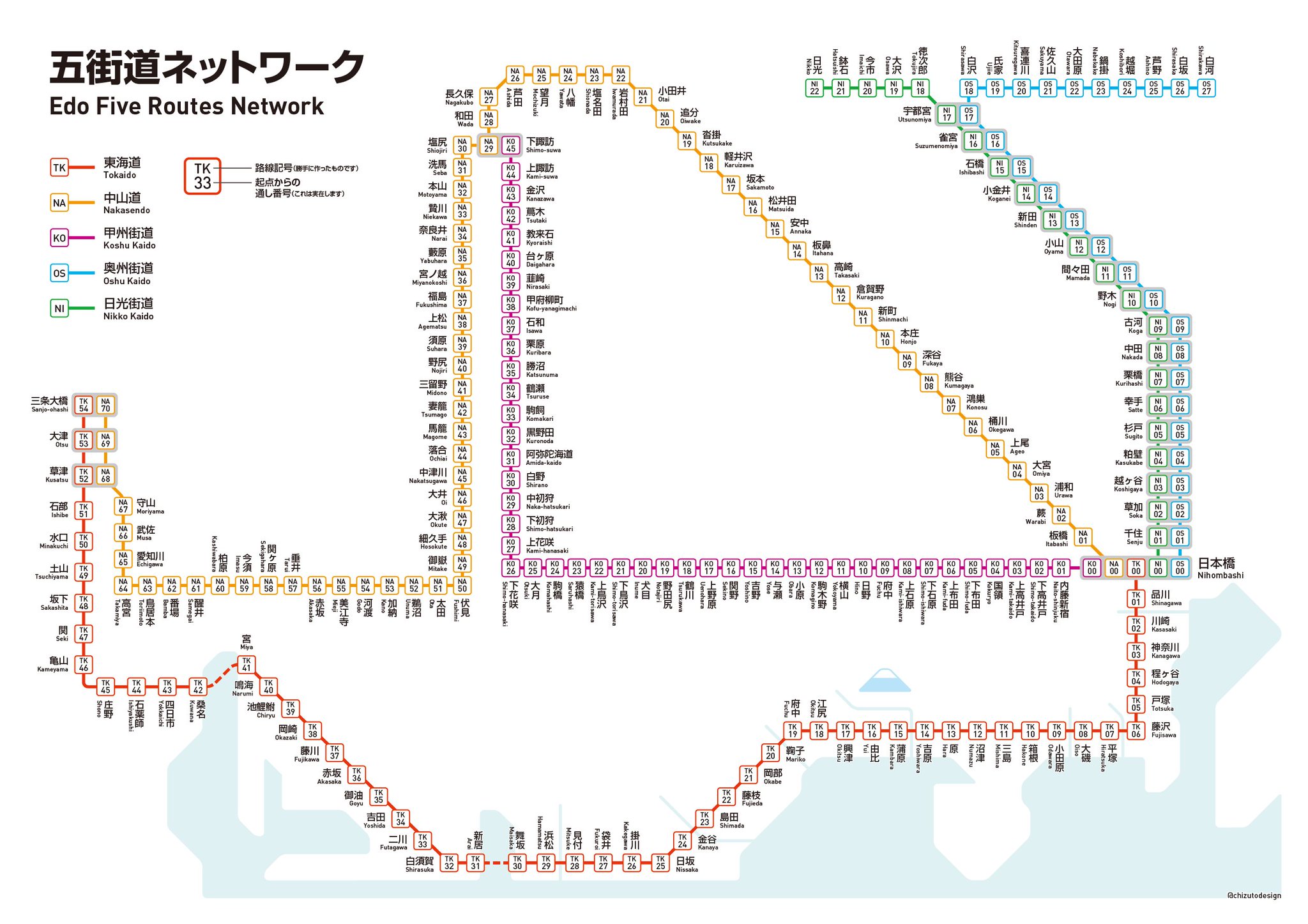 地図とかデザインとか On Twitter 江戸時代の五街道を現代の路線図風に作ってみました A4サイズに収めるためにかなり無理している箇所がありますがどうかご容赦を 路線図 五街道 東海道 中山道 甲州街道 奥州街道 日光街道