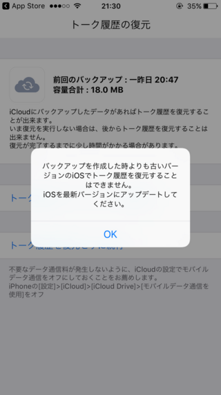 Lineのトーク履歴が復元できない問題発生中 バックアップを作成した時よりも古いバージョンのiosでトーク履歴を復元することはできません Ibitzedge